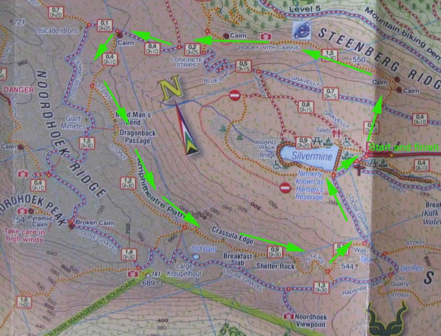 From the Silvermine Dam parking, up to Steenberg Ridge, across to the Amphitheatre Path and down to the Dam. About 2 hours.